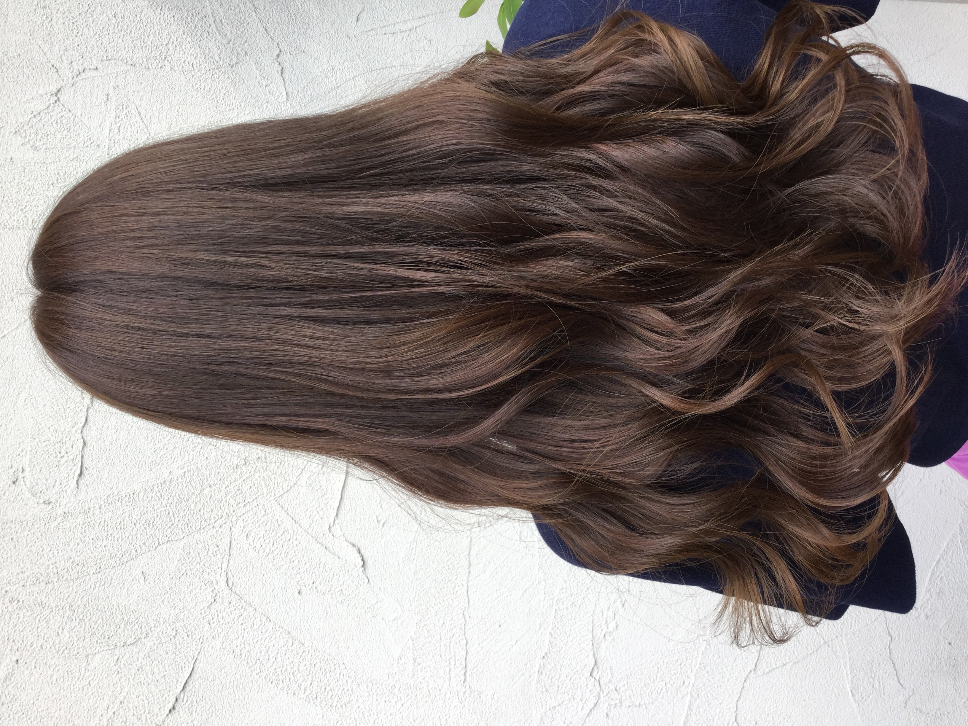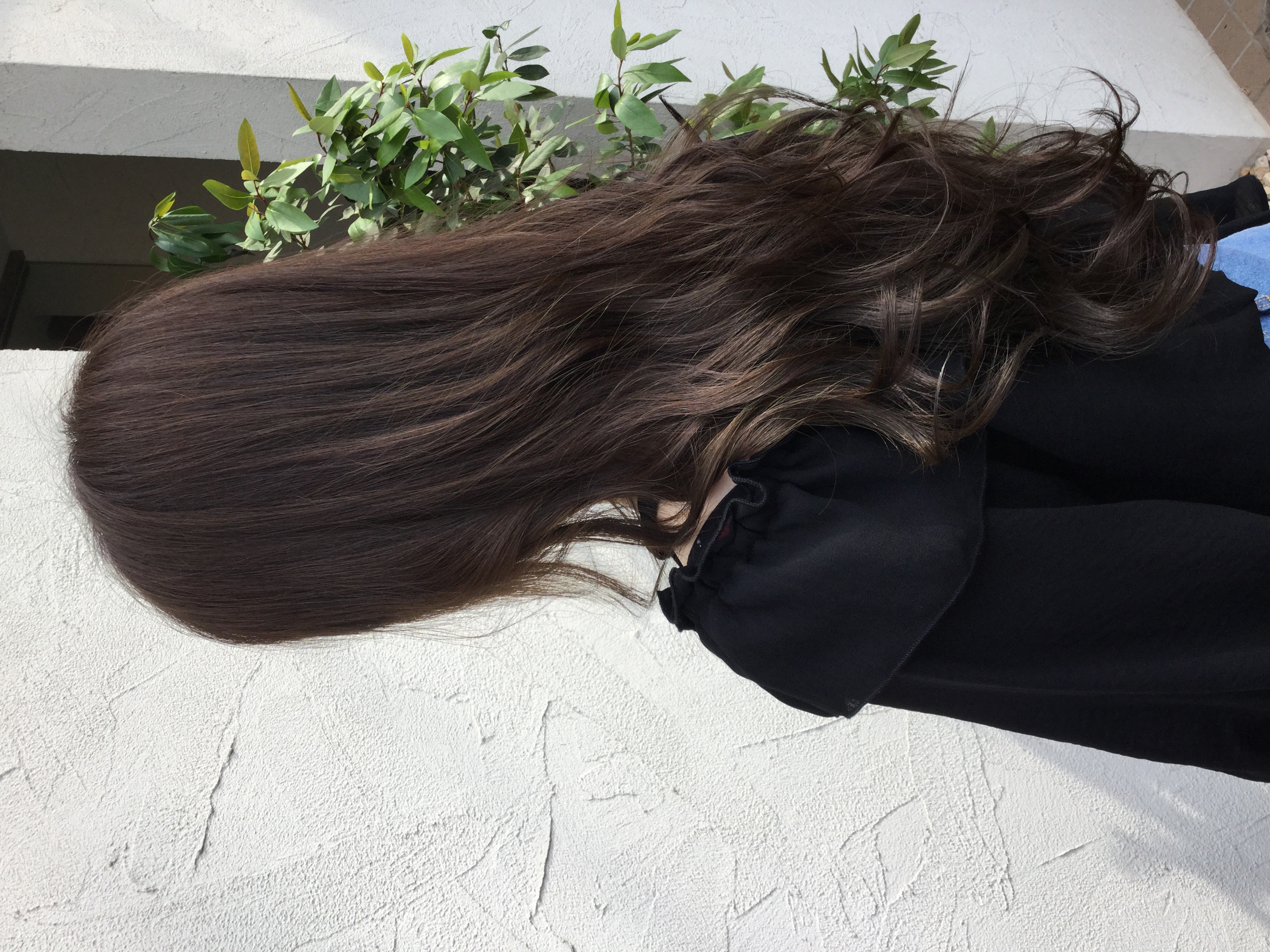 室内では黒髪に見えるほどのカラーですが、軽やかで深みある色味で外で見ると透明感があります。